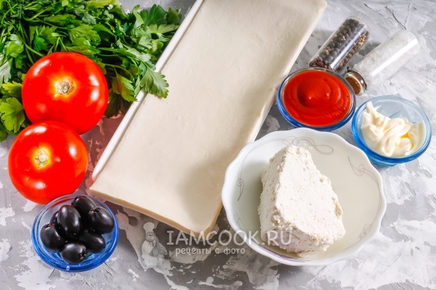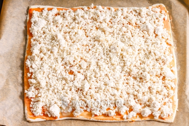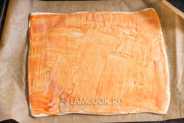 Раскатайте слоеное тесто в прямоугольный или квадратный пласт. Соедините кетчуп и майонез любой жирности, смажьте полученным соусом основу. Разогрейте духовку до 200°С.