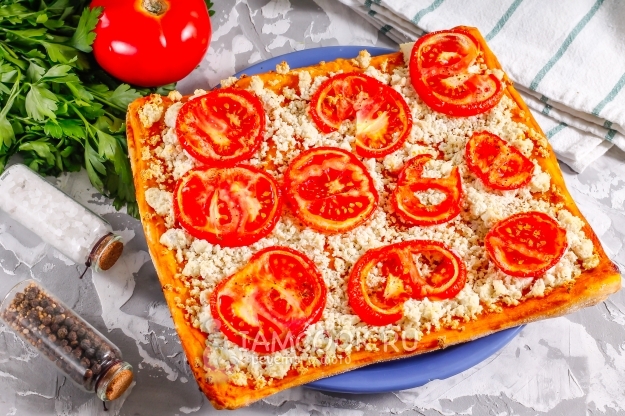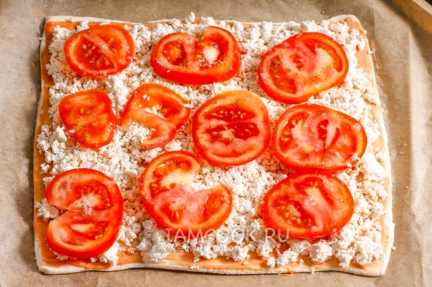 Промойте помидоры в воде, вырежьте зеленую сердцевинку и нарежьте кружочками. Выложите нарезку на сыр. Присолите и поперчите. Поместите противень в духовку и испеките пиццу в течение 15-20 минут, в зависимости от готовности теста.