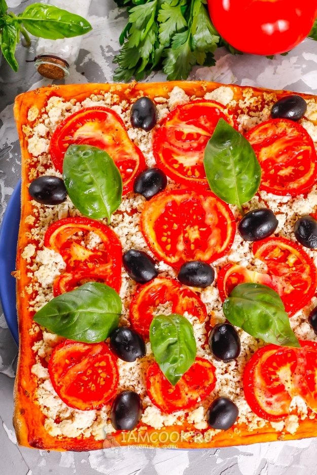 Маслины без косточек разрежьте пополам и украсьте ими блюдо. Не забудьте про листья базилика. К столу пиццу с рикоттой подавайте как в теплом, так и в холодном виде - она одинаково вкусна!