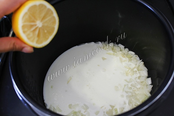 Затем влейте в мультиварку кефир. Выдавите сок из лимона.