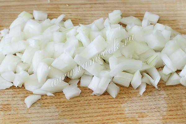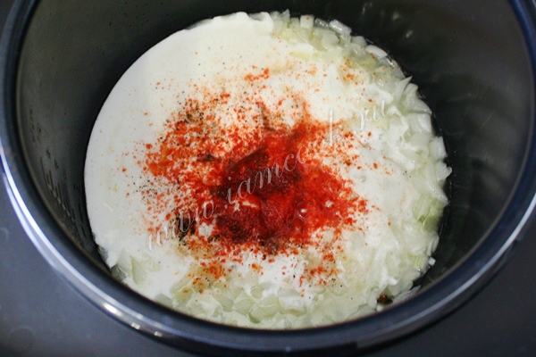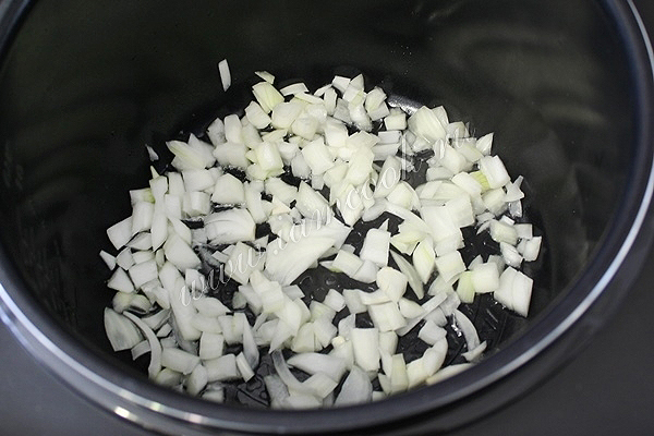 В чашу мультиварки налейте растительное масло. Включите режим «Жарка» или «Выпечка». Всыпьте в чашу лук и жарьте 10 минут с открытой крышкой.