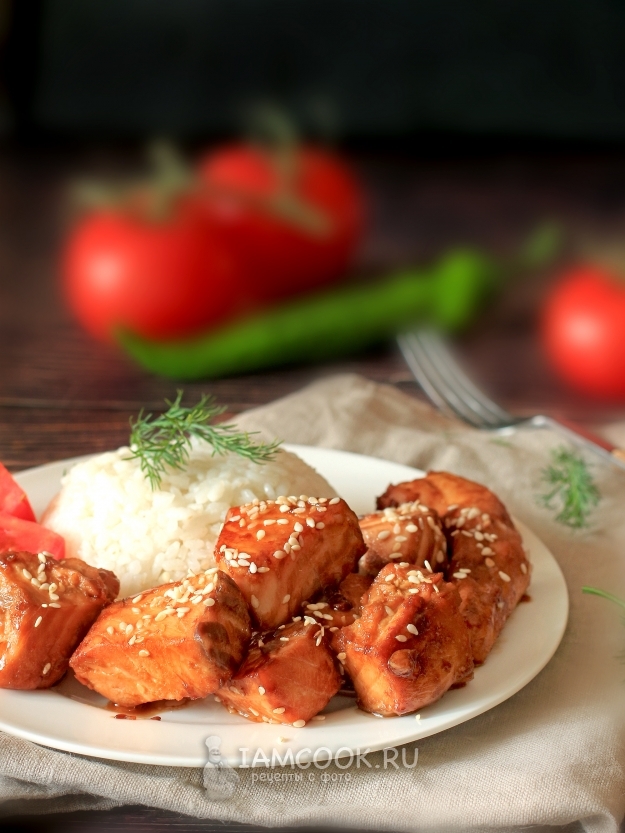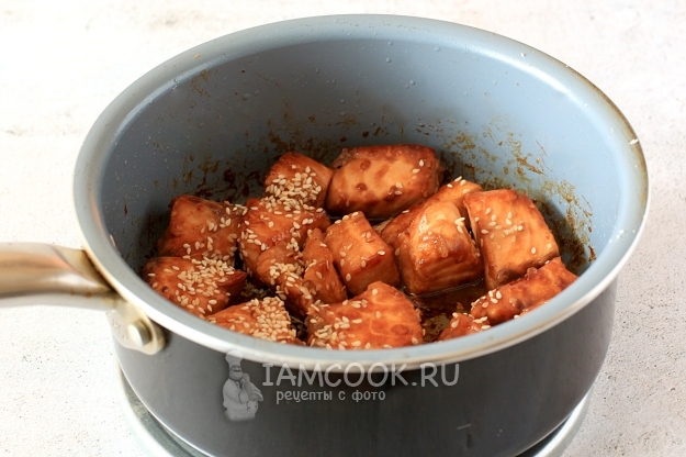 Готовую семгу в соусе терияки посыпьте кунжутом и подавайте с любым гарниром или салатом.