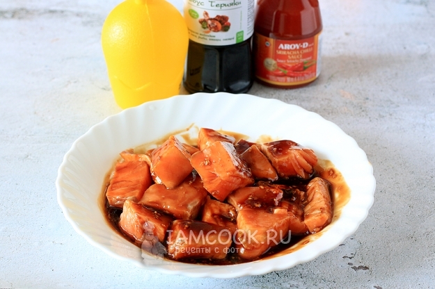 Нарежьте рыбу на кусочки и замаринуйте в полученном соусе. Оставьте минимум на 30 минут, лучше на пару часов.