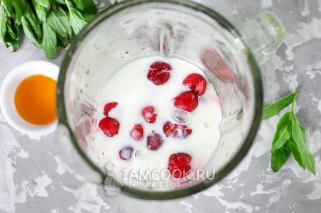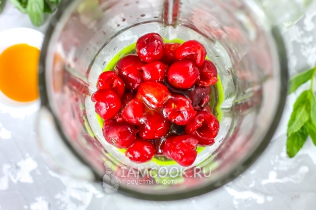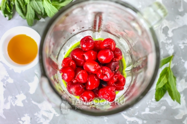 Промойте черешню в воде, очистите от хвостиков и косточек. Высыпьте в чашу блендера.