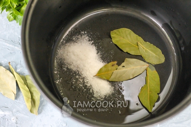 В чашу всыпьте соль и лавровые листья. Влейте кипяток и активируйте технику на режим "Варка" на 15 минут, в зависимости от модели техники.