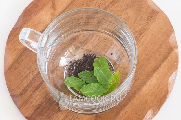 В заварочный чайник или другую чистую емкость положите заварку и листочки мяты. Стебель также можно измельчить и добавить для заваривания.
