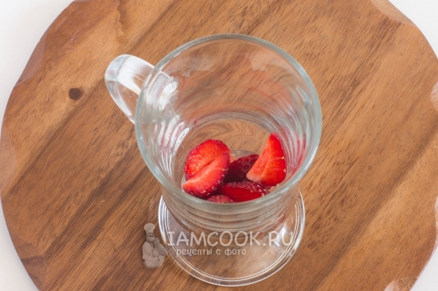 У клубники удалите плодоножки, промойте ягоды под проточной водой. Разрежьте каждую ягоду на 4 части и добавьте в стакан или чашку.