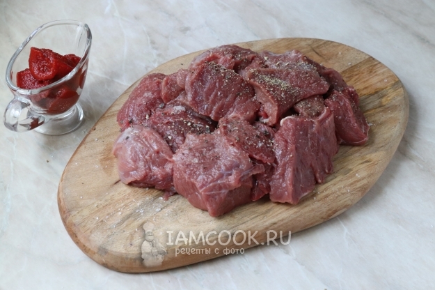 Для приготовления тушеной говядины в томатном соусе подготовим продукты по списку к рецепту.