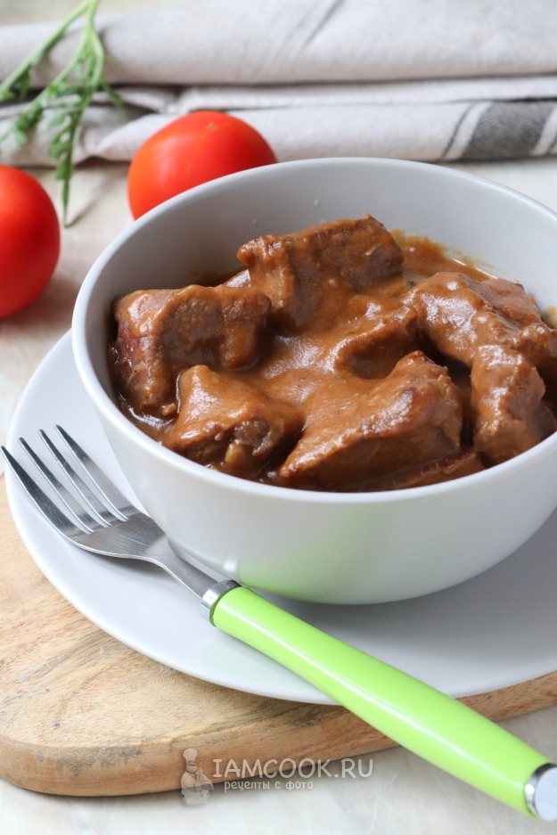 В очередной раз предлагаю приготовить вкуснейшее блюдо из говядины. Мясо по данному рецепту предварительно нужно будет обвалять в муке, обжарить и только потом тушить в томатном соусе, без добавления каких-либо овощей и круп. Такой способ значительно упростит процесс готовки или выручит в случае отсутствия на кухне дополнительных продуктов.