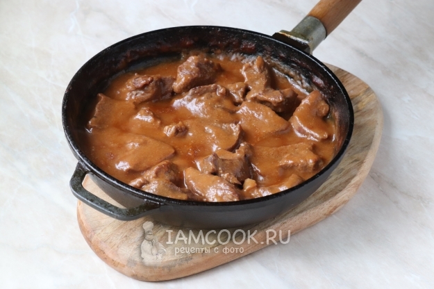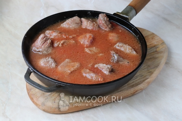 Доведём жидкость до кипения, уменьшим нагрев до минимального и будем тушить говядину в томатном соусе до готовности, не забывая периодически помешивать, чтобы подлива не подгорела. На приготовление данного блюда уйдёт как минимум 50-60 минут, в зависимости от жёсткости мяса. По надобности в процессе тушения воду можно доливать. За счёт муки томатный соус загустеет и приобретёт бархатную текстуру.