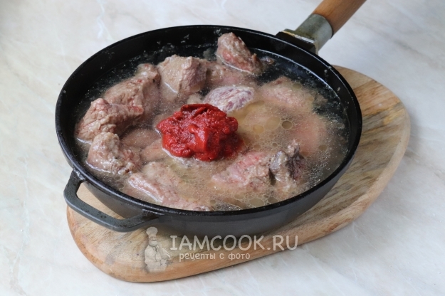 Добавим в сковороду томатную пасту и чистую фильтрованную воду. Перемешаем.