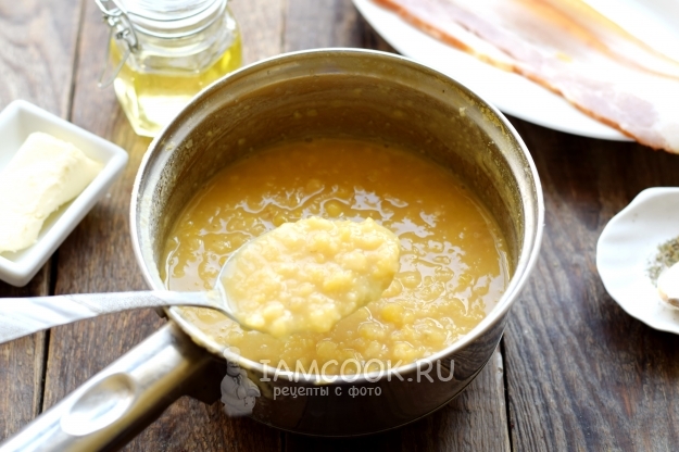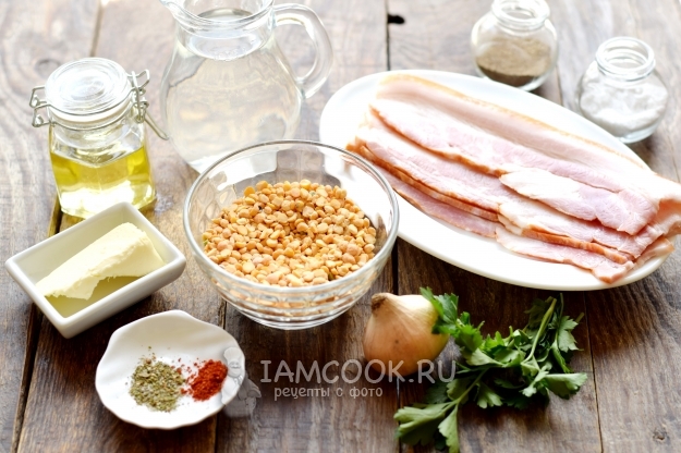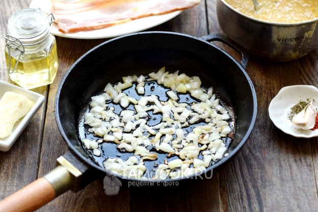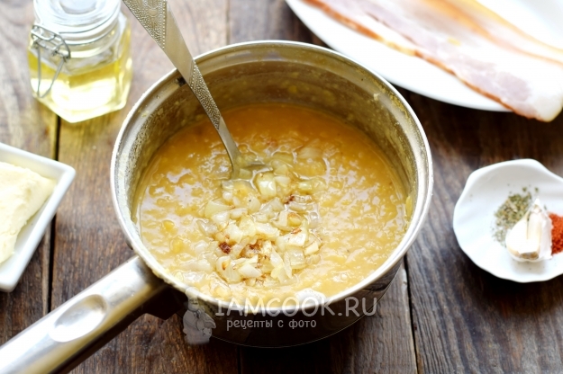 Для идеального пюре необходимо правильно подобрать пропорции бобовых и жидкости, в которой они будут вариться. Также на вкус пюре влияют специи и дополнительные элементы. В само пюре будем добавлять жаренный в масле лук, это сделает его ароматнее, нежнее и вкуснее. В качестве дополнения к гороховому пюре используем бекон. Чтобы бекон в полной мере раскрыл свой вкус и аромат, его следует обязательно обжарить.