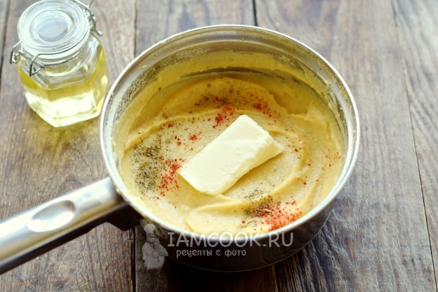 Добавьте кусок сливочного масла, перемешиванием распределите его по пюре. Добавьте специи по вкусу.