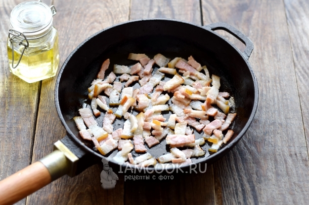 Бекон нарежьте полосками, закиньте на горячую сковороду, смазанную маслом, обжарьте 2 минуты, периодически перемешивая.