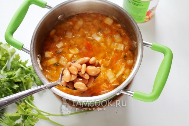 Добавьте в щи фасоль из банки, лавровый лист и проварите минут 5-7 всё вместе. Добавьте зелень. Дайте настояться.