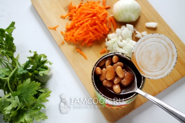 Тем временем приготовьте овощную заправку: тонкой соломкой нарежьте морковь, и кубиком - репчатый лук. Откройте банку консервированной в томате фасоли. Если у вас фасоль без добавления томатной пасты, то пасту можно при желании добавить или сварить белые щи.