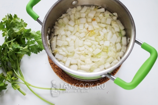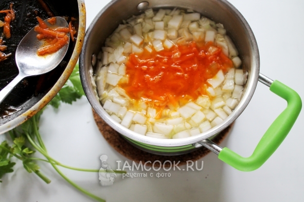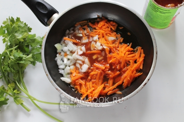 На сковороде с маслом припустите лук и морковь, добавьте томатную заливку из фасоли, немного потушите.