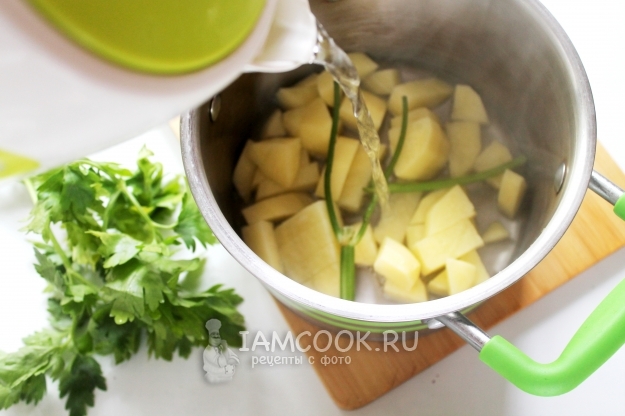 Для ускорения процесса залейте картошку кипятком из чайника, добавьте стебли и коренья на свой вкус и сварите овощной бульон.
