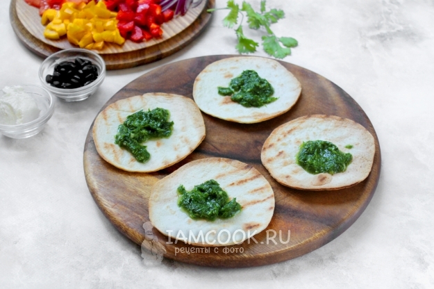 На обугленные тортильи первым выкладываем зеленый соус. Затем — ассорти из разноцветных овощей.