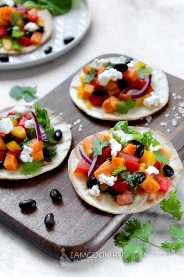 Для перекуса предлагаю приготовить небольшие в диаметре овощные тортильи — такие подают открытыми или слегка согнутыми. Выбирайте начинку по сезону, желанию. Чем больше цвета, разной фактуры и аромата, тем лучше. Соединяйте отварные, сырые, запеченные, консервированные дары природы.
