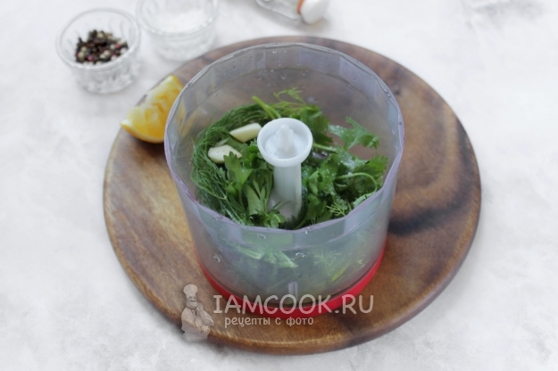 Для прослойки измельчаем свежую зелень, чеснок, вливаем сок лимона, оливковое масло, солим-перчим.