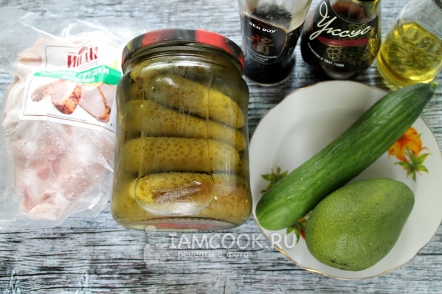 Свежий огурчик и спелое авокадо уравновешивают вкусовую композицию, а салатная заправка на основе бальзамика и соевого соуса подчеркивает пикантную нотку салата.