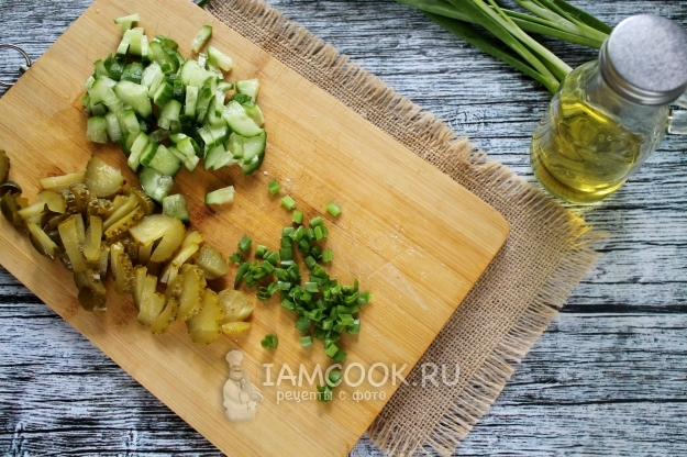 Кубиком или соломкой нарежьте огурцы и мелко нашинкуйте зеленый лук.