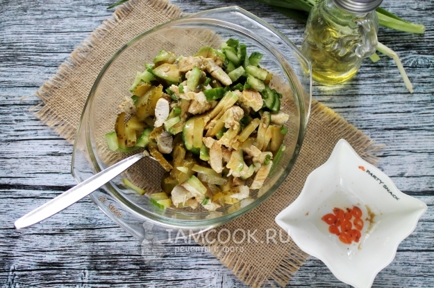 Заправьте салат. Перемешайте. Можно подавать салат сразу, а можно дать ему немного настояться в холодильнике и пропитаться всем компонентам вкусом заправки и друг друга.