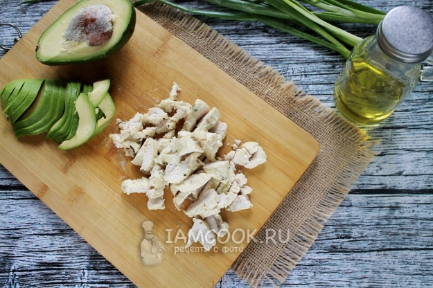 Нарежьте филе кусочками поперек волокон. Спелое авокадо очистите от кожицы и нарежьте дольками.
