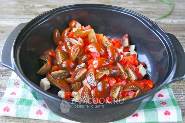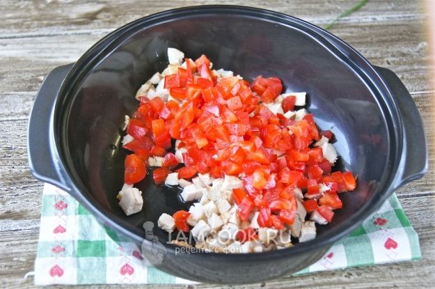 Перец вымойте, удалите семена и нарежьте на маленькие кусочки.