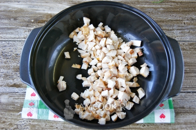 Для начала нарежьте куриное филе на маленькие кусочки.