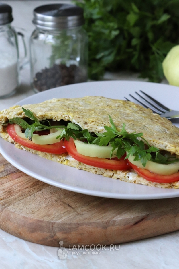 Аккуратно, с помощью деревянной или силиконовой лопатки снимем его и переложим на порционную тарелку. По желанию дополним блюдо свежими овощами и зеленью. Для эффектной подачи их можно выложить на одну половину блина, накрыв второй половиной.