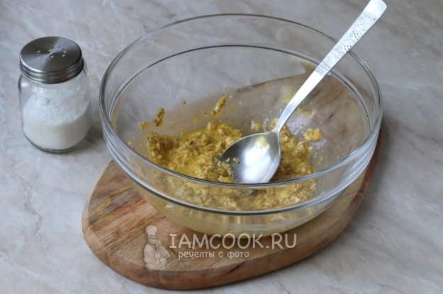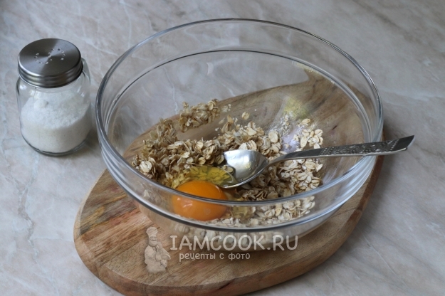 В подходящую миску вобьем куриное яйцо, добавим овсяные хлопья (предпочтительно быстрого приготовления), соль и немного тёплой фильтрованной воды, которую, по желанию, можно заменить молоком.