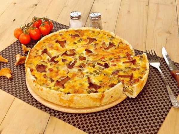 Приподнимаем борт, срезаем по окружности излишки теста, прокалываем вилкой дно. Всыпаем груз-фасоль и на первые 10 минут ставим в разогретую до 200 градусов духовку. Слегка подсушиваем, чтобы тесто не осталось сырым от влажной начинки.