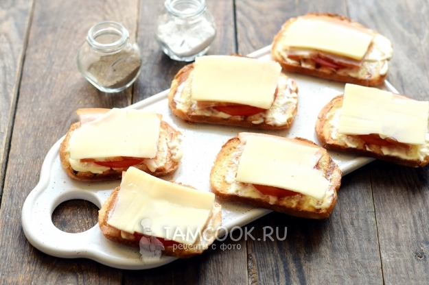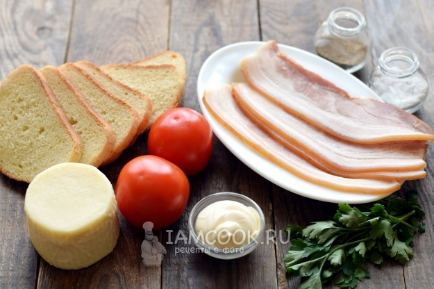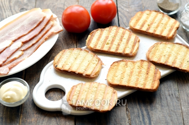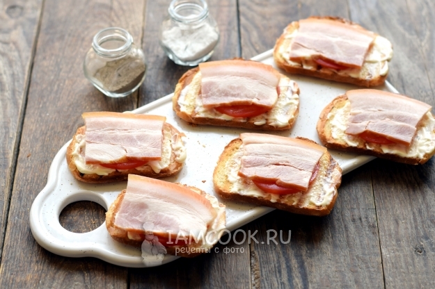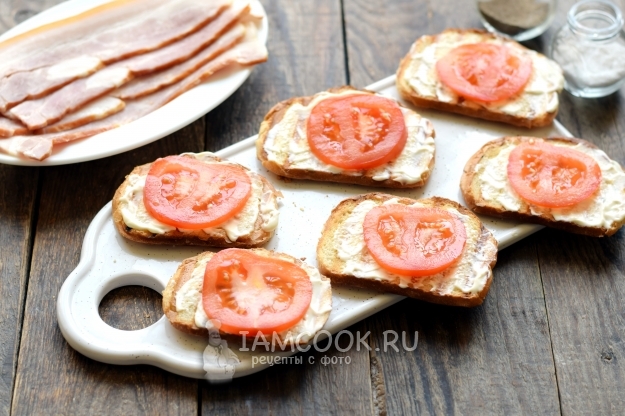 Хлеб для бутербродов необходимо слегка обжарить, чтобы получились гренки. Хрустящие гренки смягчаются майонезом, сверху ложатся тонкие полоски бекона. Для сочности бутерброды дополняются свежими помидорами, в завершение кладутся слайсы сыра.