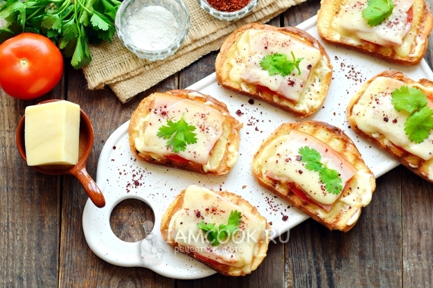 Подавайте бутерброды на стол в теплом состоянии, украсьте их зеленью, посыпьте специями.