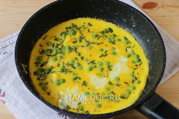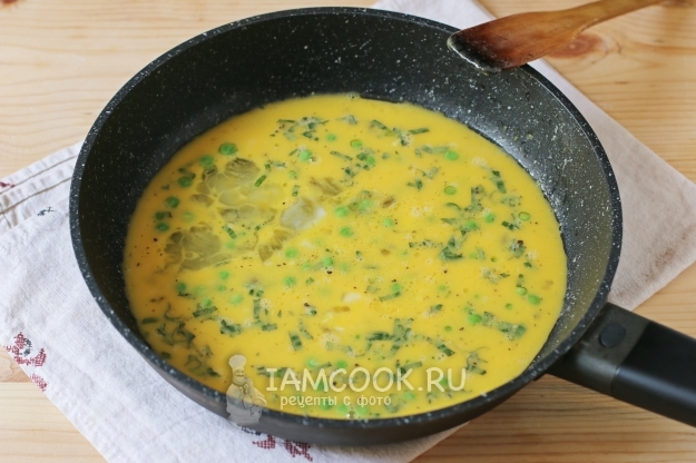 Вливаем яичную смесь в сковороду к горошку и продолжаем готовить на небольшом огне около 3-4 минут.