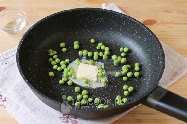 Разогреем в сковороде сливочное масло и слегка обжарим в нем горошек в течение одной-двух минут, периодически помешивая его лопаткой.