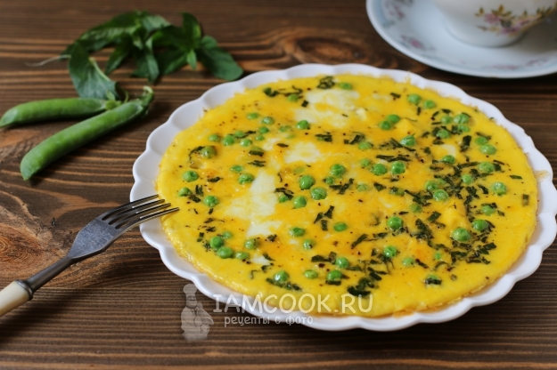 Готовый омлет с зеленым горошком перекладываем на тарелку и тут же подаем на стол.