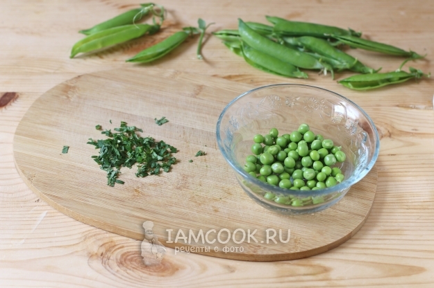 Раскроем гороховые стручки и достанем из них горошинки. Важно, чтобы горошек был молодым, тогда у него есть сочность и хороший вкус, омлет с ним получается очень вкусным. Листики мяты порежем ножом очень мелко. Я раньше мяту использовала лишь как украшение для десертов или в чай, а теперь стала добавлять и в различные блюда, включая омлеты и салаты. Хочу вам сказать, что она не придает какой-то мятный вкус, она любому блюду лишь добавляет яркий акцент свежести. Поэтому не бойтесь и добавляйте, но по чуть-чуть.