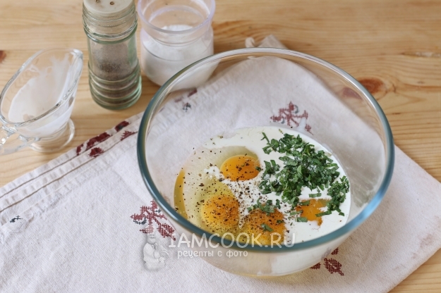 В емкость разбиваем яйца, вливаем молоко, добавляем мяту, соль и перец. Размешаем до объединения ингредиентов.