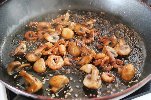 Затем потушите креветки и шампиньоны на сковороде вместе с маринадом, две-три минуты. Маринад должен выпариться, а креветки и шампиньоны покрыться пикантной глазурью. Посыпьте семенами кунжута.