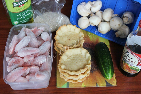 Подготовьте тарталетки, креветки, шампиньоны, терияки, оливковое масло, кунжут и огурец.