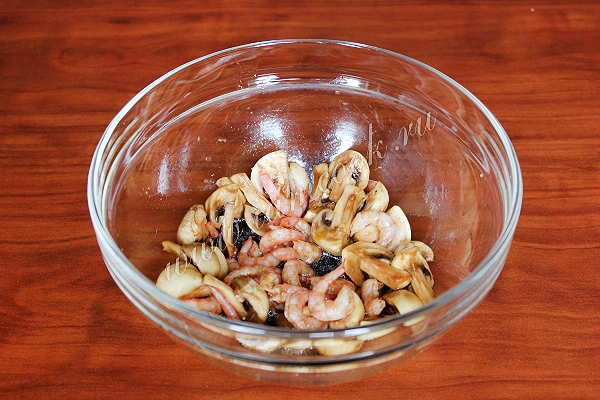 Маринуйте в полученной смеси очищенные креветки и нарезанные шампиньоны минут десять.