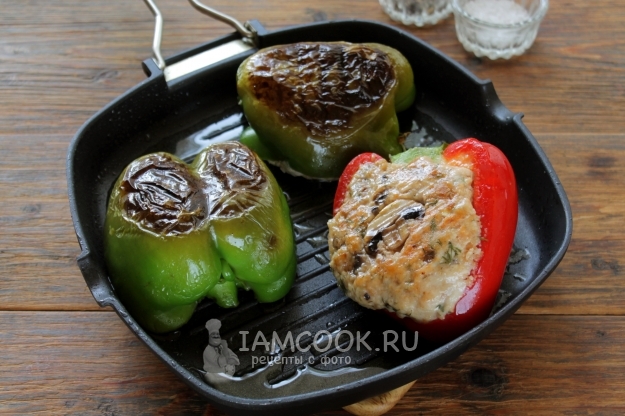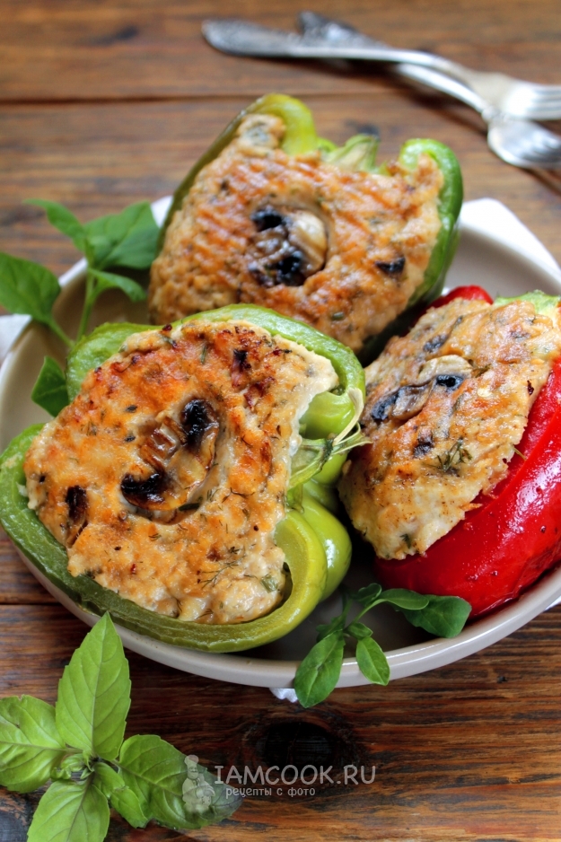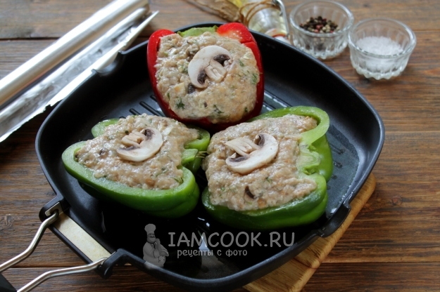 Среди множества рецептов фаршированного перца отмечу менее трудоемкий — без пассеровки овощей, отваривания риса и длительного тушения в соусе. Кроме того, если у вас, как и у меня, фарша оказалось мало, начинку можно увеличить за счет грибов и мякиша булки или другого хлеба.