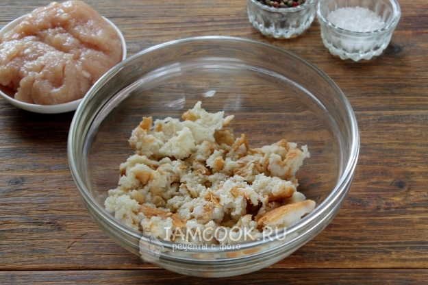 Батон, белый хлеб или булку опускаем минут на 5 в питьевую воду или молоко, затем разминаем и отжимаем всю жидкость. Нам нужен только влажный мякиш.