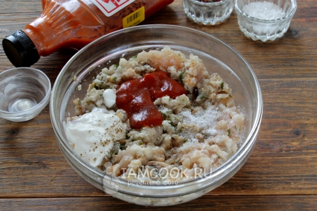 Перемешиваем со сметаной, вкусным томатным соусом, солим и перчим.