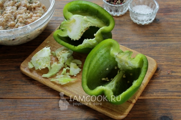 Перцы мясистых сортов разрезаем пополам и вдоль, вычищаем — удаляем семена и мягкие перегородки.