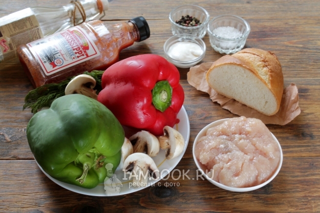 Для приготовления фаршированного перца с куриным фаршем без риса возьмите продукты по списку.