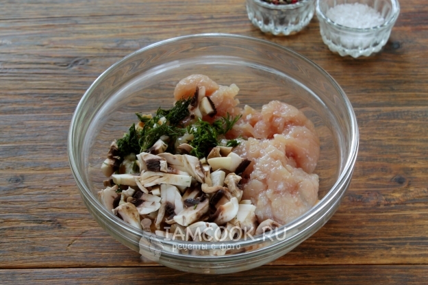 Добавляем куриный или другой фарш, измельченный укроп и шампиньоны.